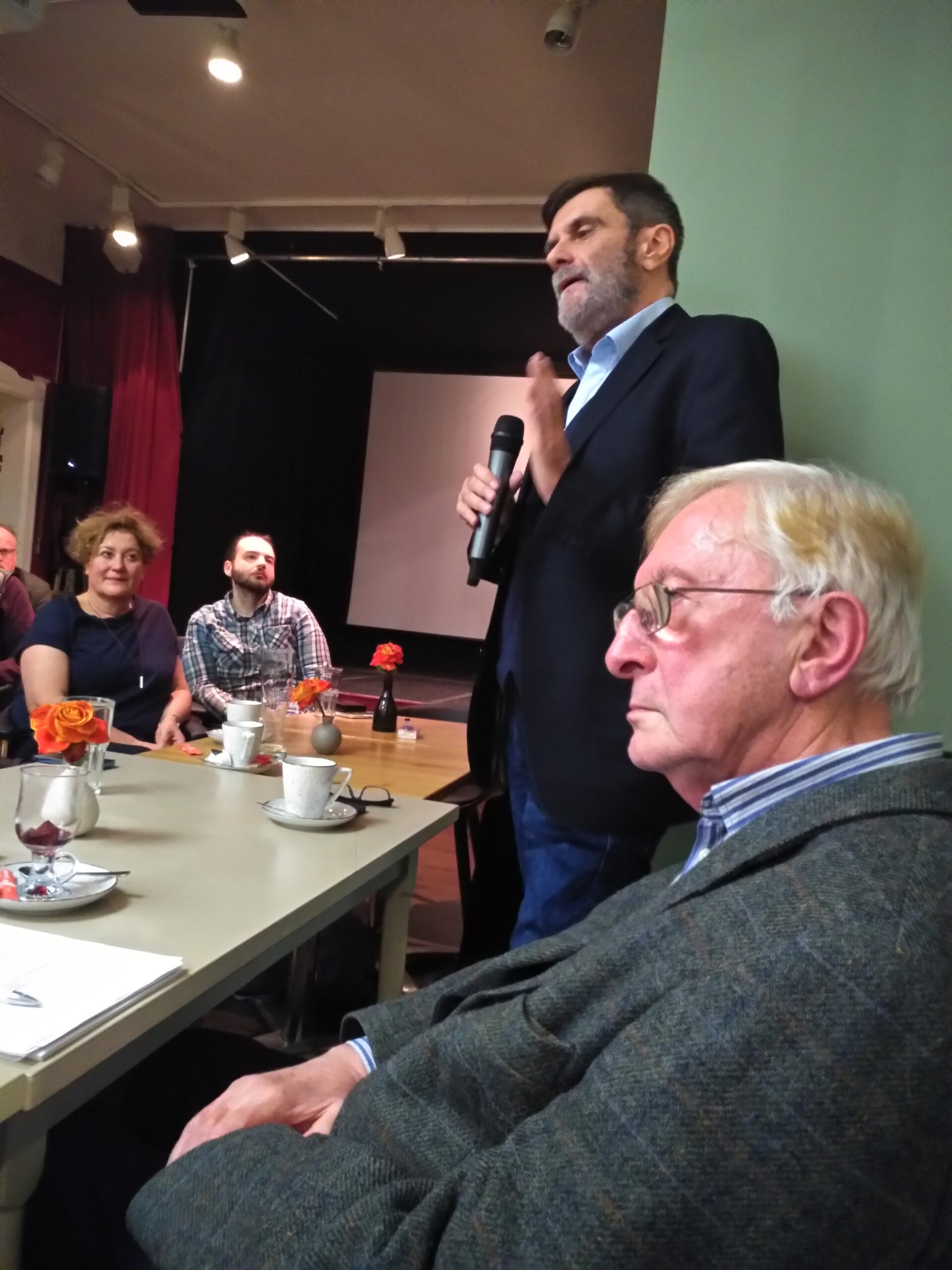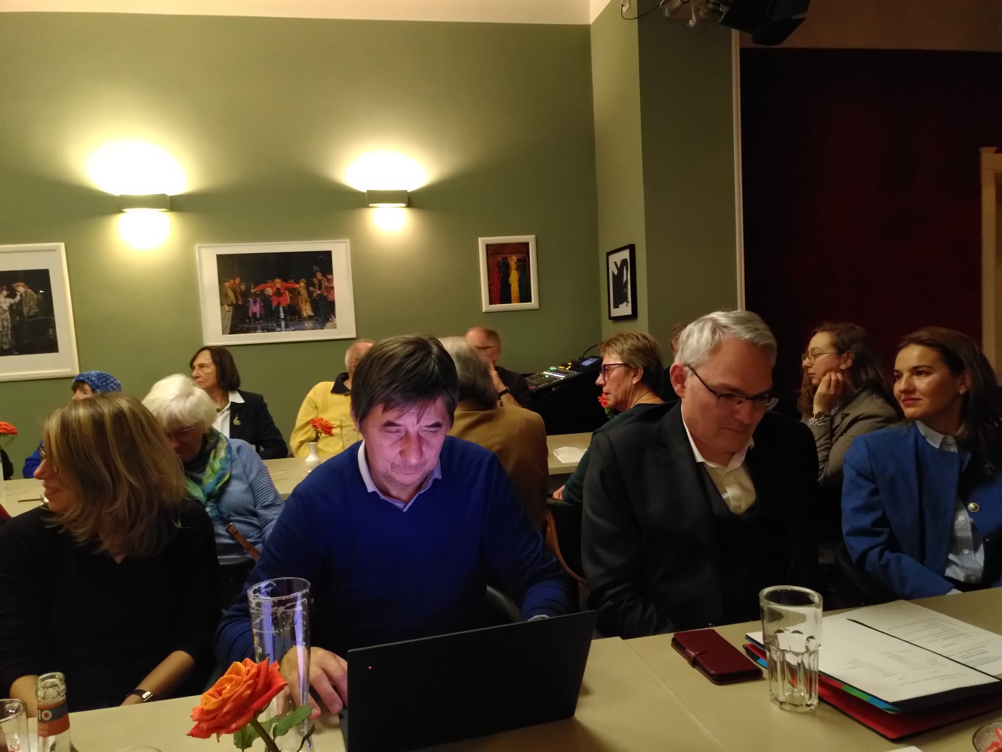 Unter Leitung von Beiratsmitglied Alexander Roth wurde anschließend der neue Vorstand gewählt. Für das Amt des Präsidenten stellte sich Robert Schwartz in einer kleinen Ansprache den Anwesenden vor; er ist der DRG schon seit vielen Jahren verbunden, hatte sie über die Deutsch-Rumänischen Hefte kennengelernt und möchte u.a. mehr rumänische Filme und Musik nach Berlin bringen. Janka Vogel, bisher Schriftführerin, kandidierte für das Amt der Vizepräsidentin und nannte als Zukunftsthemen der DRG u.a. eine Verstärkung der Kooperationen mit rumänischen PartnerInnen, vermehrte digitale Angebote und eine verstärkte Einbeziehung der Mitglieder. Neu für den Vorstand kandidierten Natalia Toma, die bereits bis 2021 im Vorstand mitgearbeitet hatte, für das Amt der Schriftführerin, Daniela Boltres, Sprach- und Kulturaktivistin mit siebenbürgischen Wurzeln, und Joachim Krauß, Sozialwissenschaftler und langjähriger Rumänienkenner u.a. mit dem Schwerpunkt Wohnungslosigkeit – beide als BeisitzerInnen. Wieder zur Wahl standen Tony Krönert für das Amt des Schatzmeisters, Christof Kaiser, Hermine Untch und Raluca Fritzsch als BeisitzerInnen. Alle KandidatInnen wurden einstimmig gewählt.