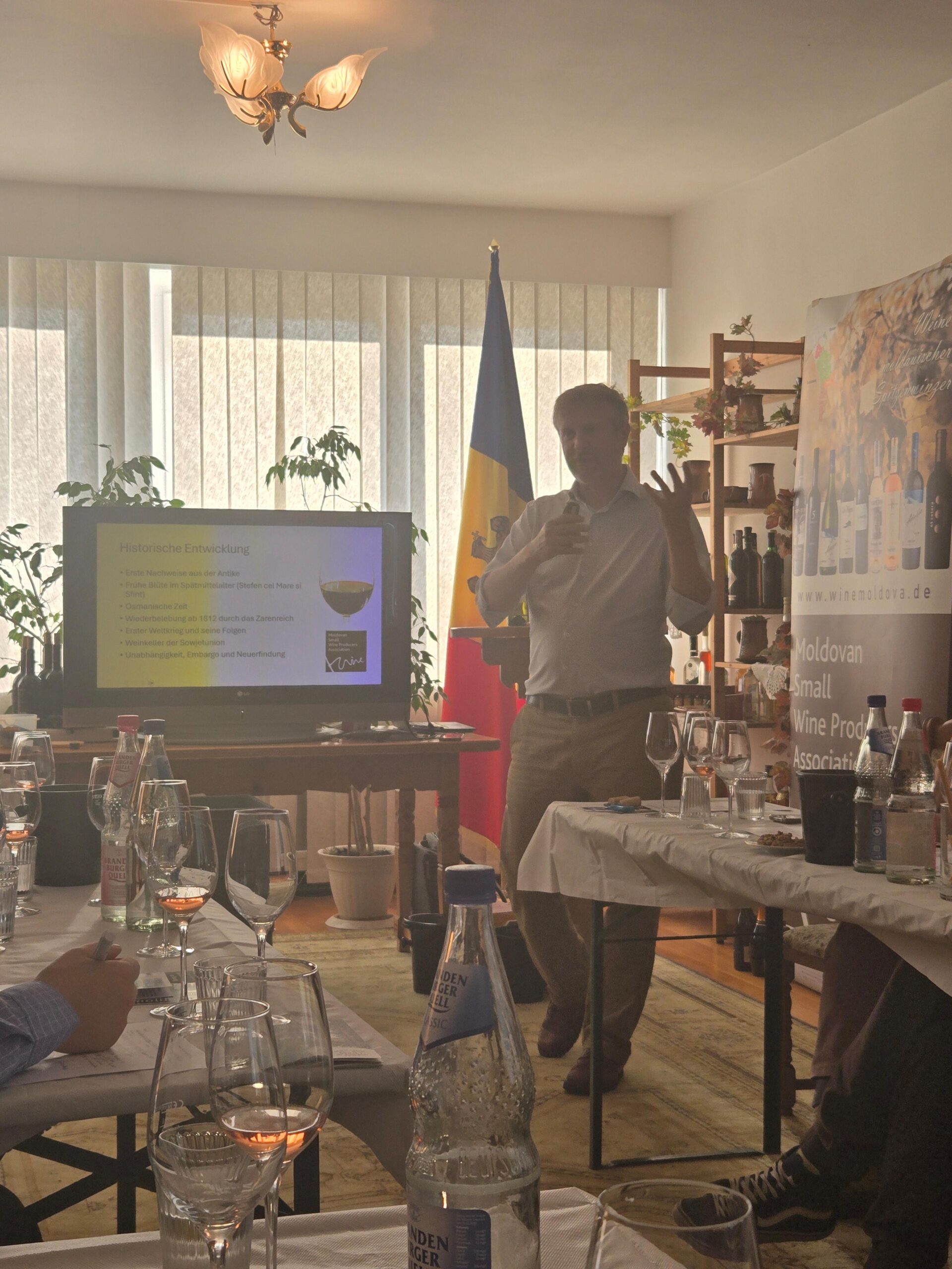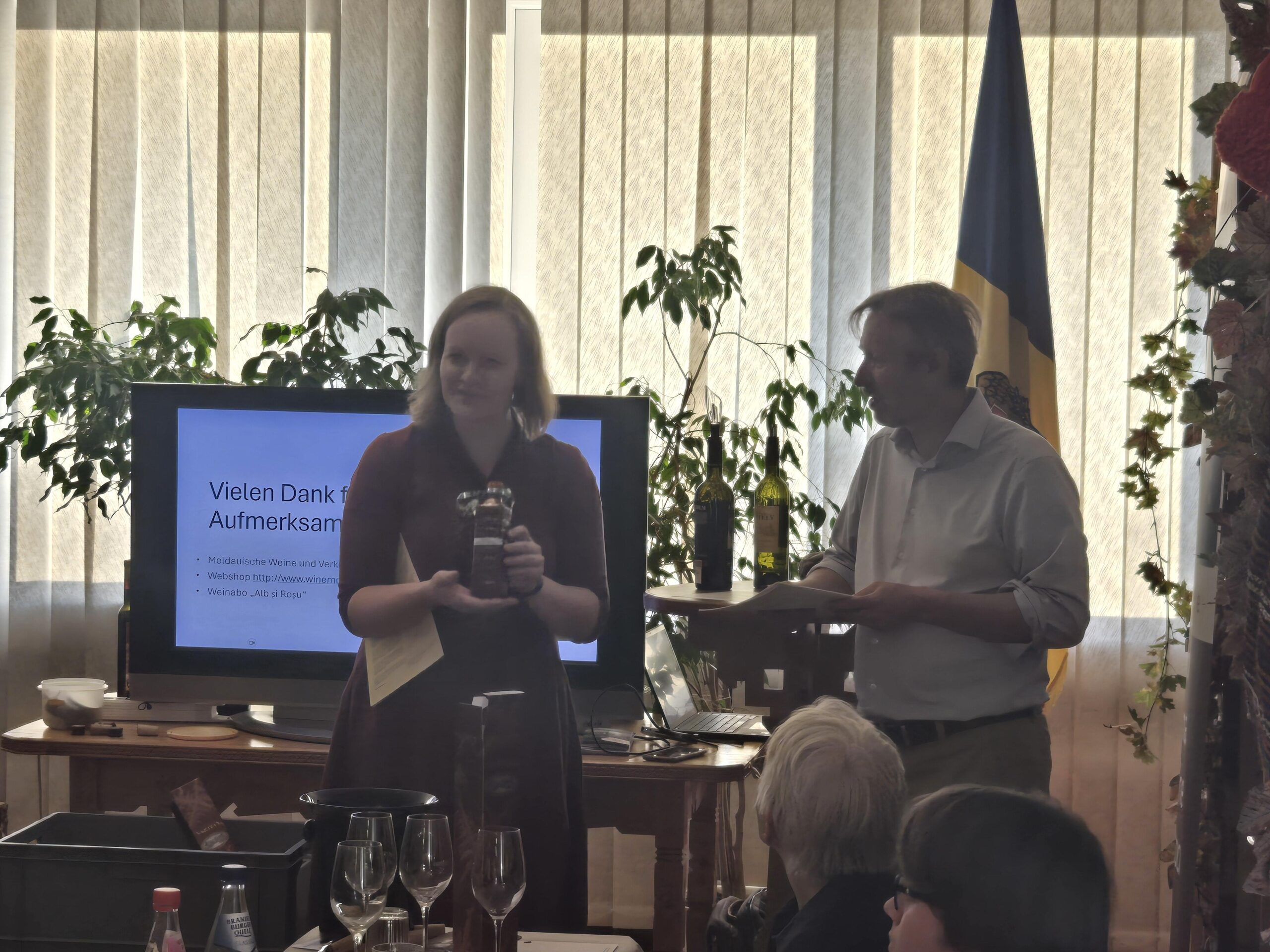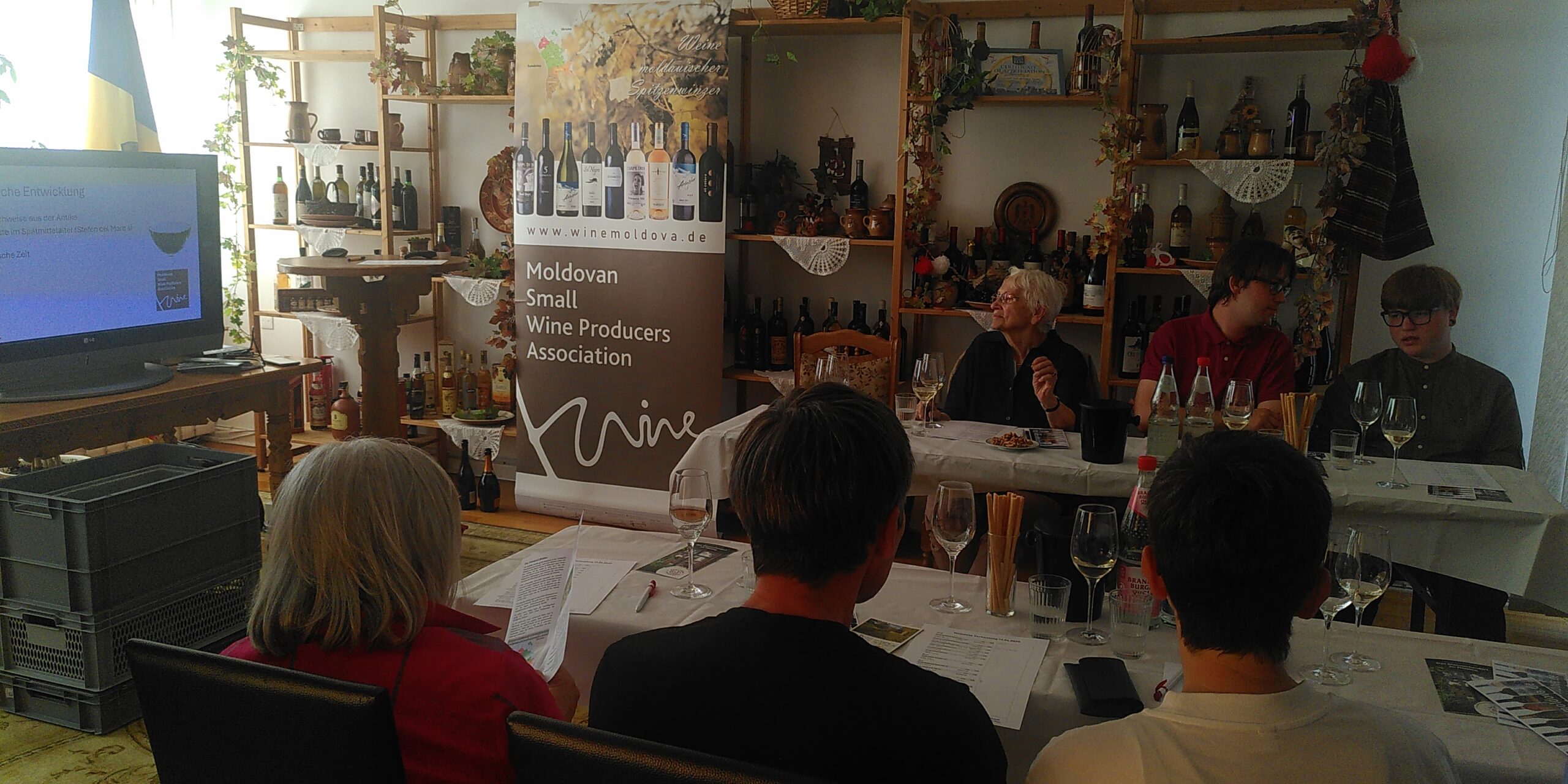 Obwohl die Republik Moldau über mehr Rebfläche pro Einwohner als jedes andere Land verfügt, ist moldauischer Wein in Deutschland immer noch wenig bekannt. Im Rahmen dieser Veranstaltung haben über 20 BesucherInnen theoretisch und praktisch mehr über die Geschichte des Weinbaus in der Republik Moldau erfahren. Insgesamt wurden neben vier weißen, einem Rosé- und fünf Rotweinen auch zwei (helle) Schaumweine und ein Eiswein als Dessertwein verkostet. Auch Bio-Weine waren dabei.
