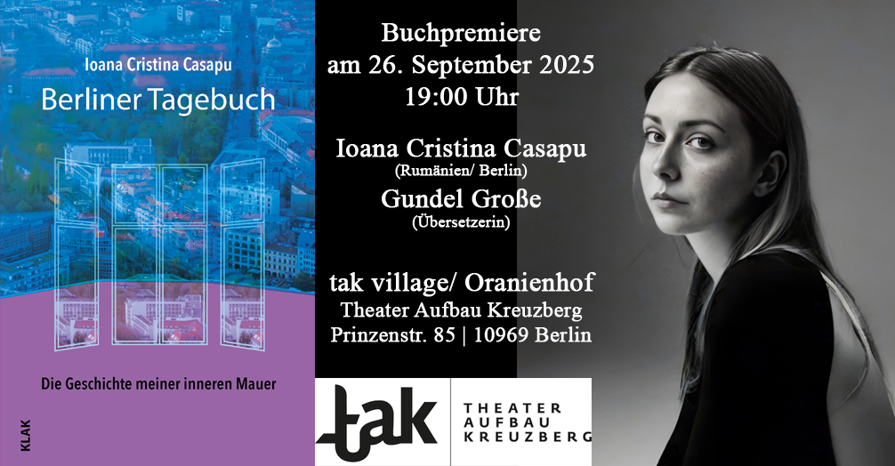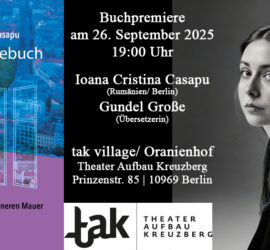 Lesung, Gespräch und Get Together Gäste: Ioana Cristina Casapu (Autorin), Gundel Große (Übersetzerin), u.a. Moderation: Jörg Becken (Verleger) Sprache der Veranstaltung: Deutsch, Englisch Ioana Cristina Casapu Berliner Tagebuch. Die Geschichte meiner inneren Mauer Aus dem Rumänischen übersetzt von Gundel Große „In jedem von uns existiert eine Berliner Mauer“. Unter diesem […]