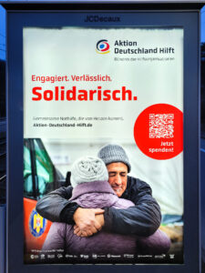 Und wenn da niemand ist, also wirklich niemand? Ich habe Angst. Es könnte jemand da sein, ungesehen, unbeschreibbar. Aber gefühlt. Ich kann’s mir noch nicht ‚mal vorstellen, obwohl Ingenieur und Ingenieure können doch alles wahrnehmen, messen, dokumentieren – das Sein. Sein, davor habe ich Respekt; vor allem dem Sein in der Welt.Schließlich blicke ich auf. Vor mir ein Leuchtplakat. „Solidarisch“ steht darauf. Mit einem Foto: Ein älterer Mann umarmt erleichtert eine Frau mit Strickmütze. Dahinter, leicht unscharf, ein roter Rettungswagen mit einem Logo darauf. Es ist das Logo des zentralen Rettungsdienstes des rumänischen Innenministeriums „Departamentul pentru situații de urgență – MAI“. Oben am Plakat lese ich: „Aktion Deutschland hilft“.